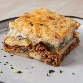 Una classica casseruola greca fatta con strati di melanzane, carne macinata speziata e salsa besciamella cremosa