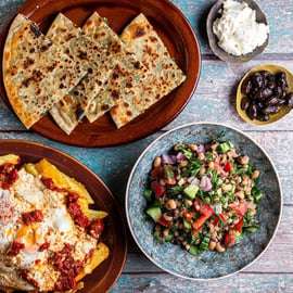 Assaggia: Bougatsa, Spezie ed erbe, Salumi, Miele, Fichi secchi, Olive, Yogurt tradizionale, Varietà di formaggi, Insalata di melanzane, Tzatziki, Vino, Tsipouro ecc.